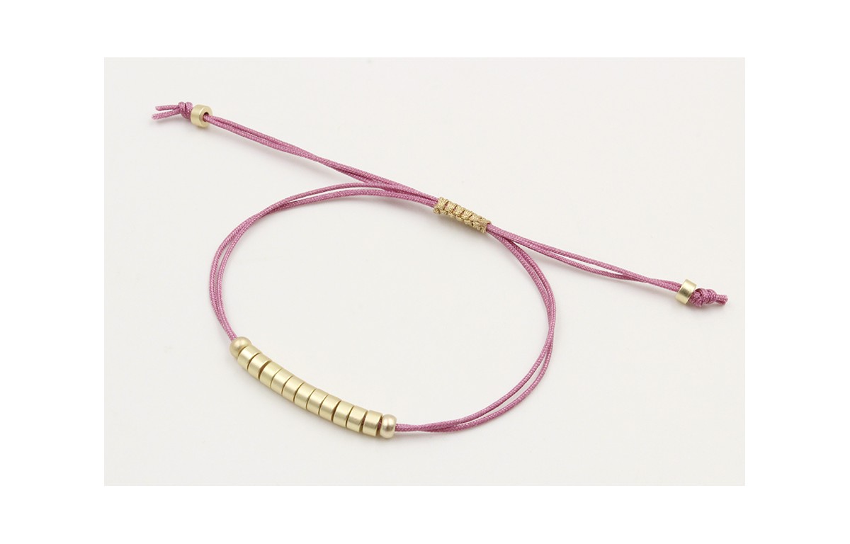 Pulsera hilo macrame malva con nudo dorado y piezas discos de 3mm. Es regulable.