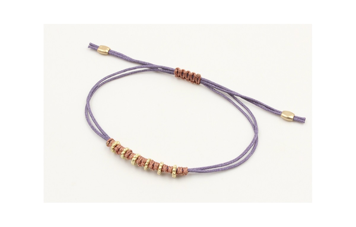 Pulsera macrame morado con nudo color oro rosa y ruedas estriadas oro mate. Es regulable.
