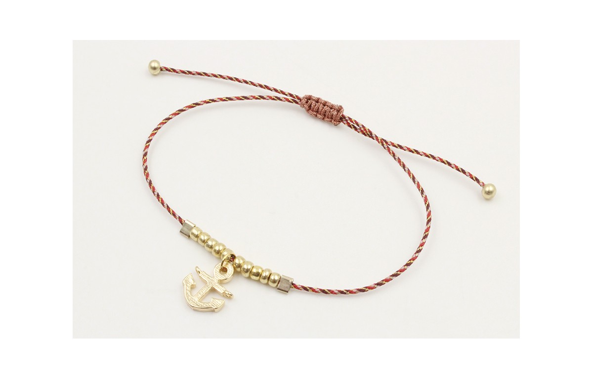 Pulsera hilo granate,oro y microdrusa oro rosa nudo macrame con ancla dorada y abalorios dorados. Es regulable