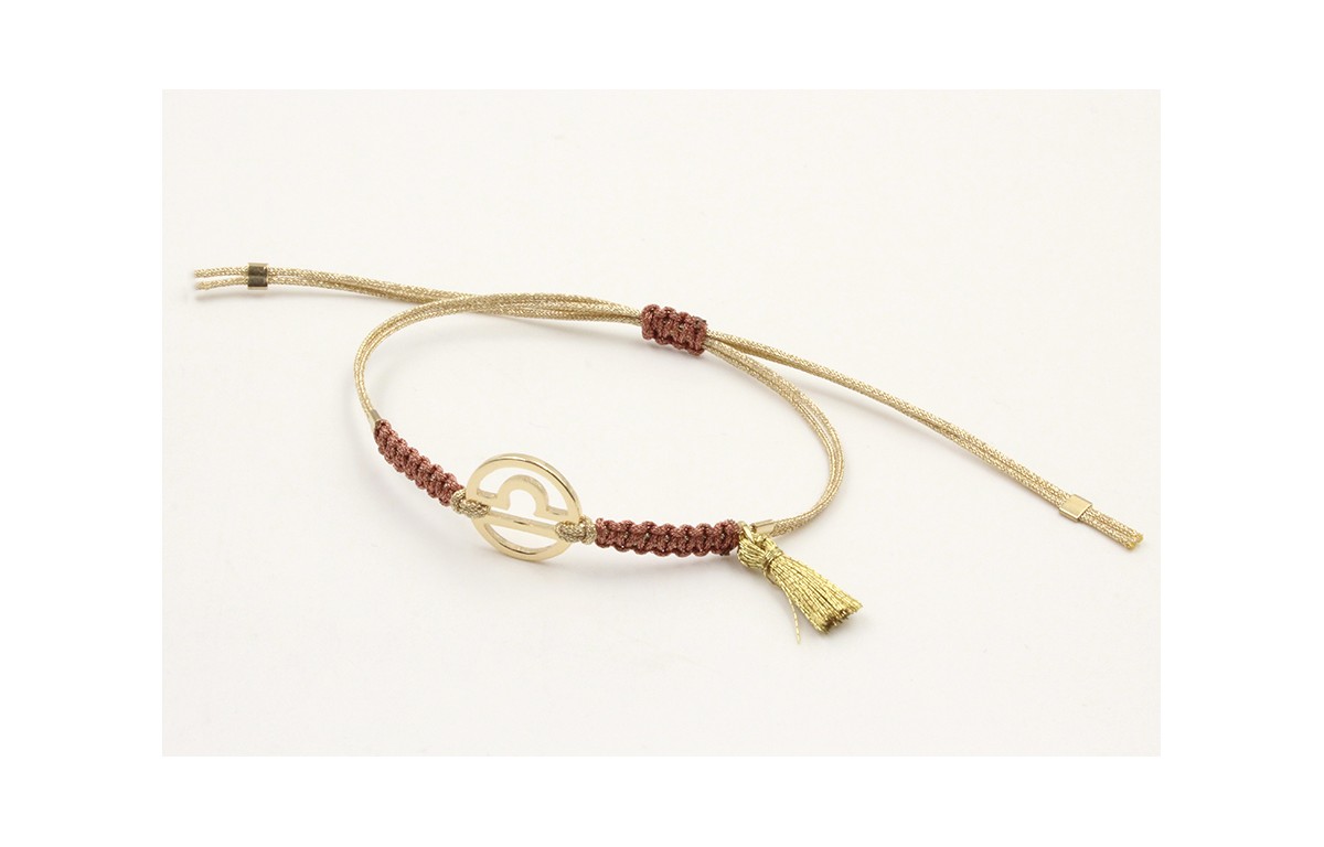 Pulsera hilo macrame oro palido con nudo oro rosa disco zodiaco Libra y pompon metalico dorado. Es regulable.