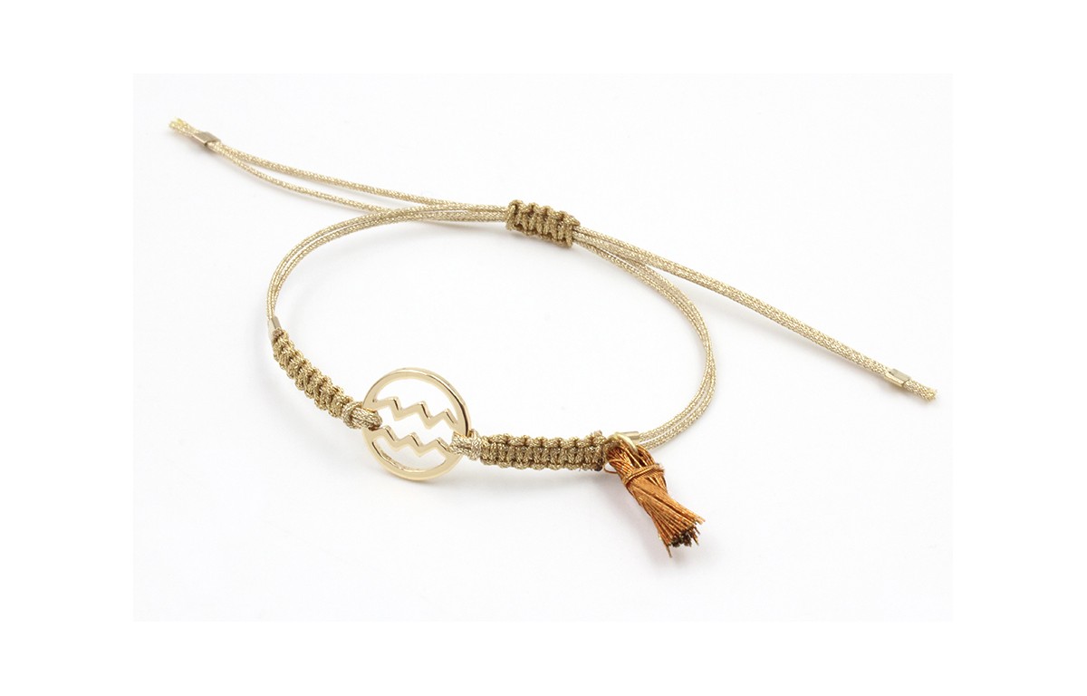 Pulsera hilo macrame oro palido con nudo dorado disco zodiaco Acuario y pompon cobre. Es regulable.