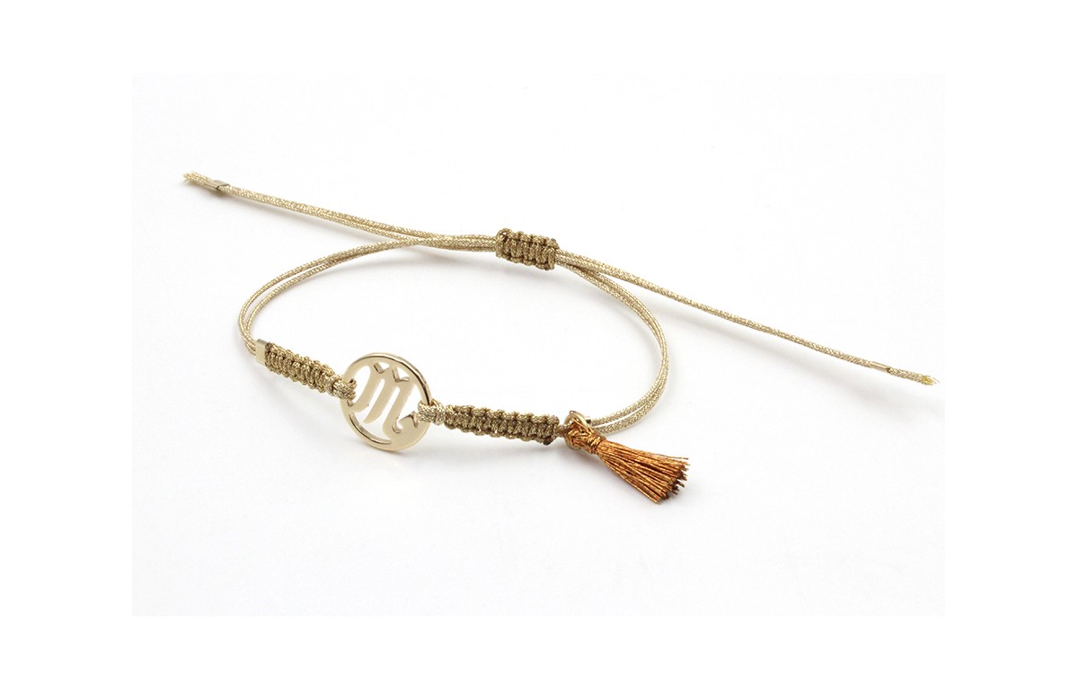 Pulsera hilo macrame oro palido con nudo dorado disco zodiaco Escorpio y pompon cobre. Es regulable.