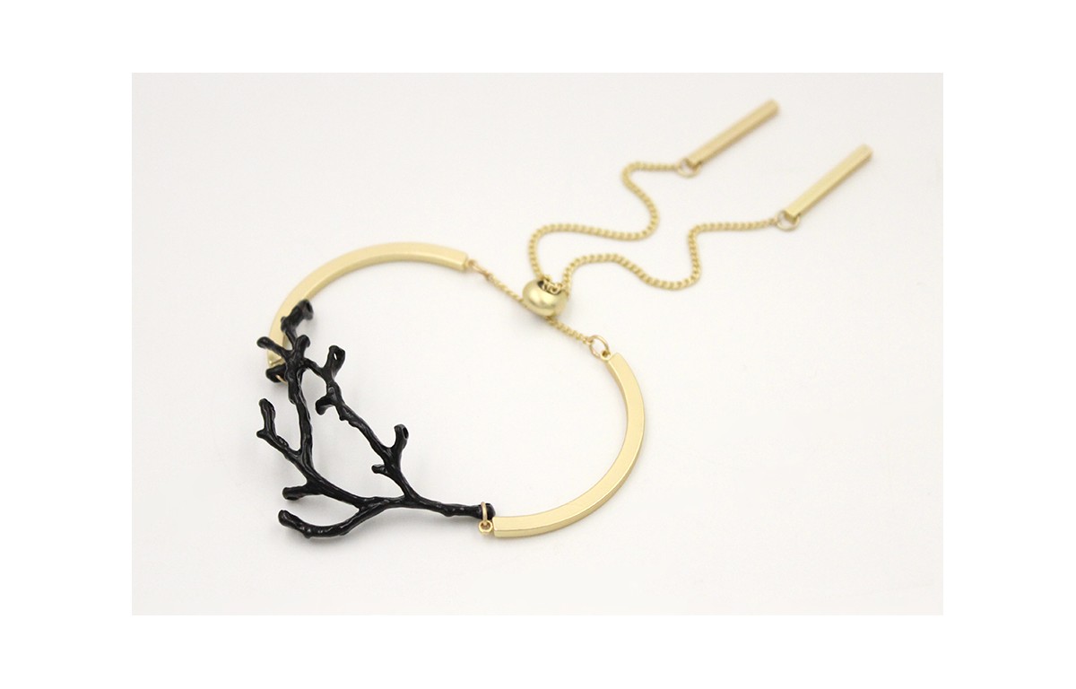 Pulsera semirrigida oro mate con rama de coral esmaltada negra y rematada con cadena y listones. Es regulable