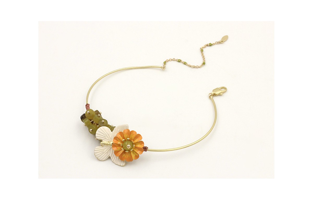 Pulsera rigida con mariposa crema, flor esmalte manual naranja, forrada con medio nudo macrame hilo oro rosa,burruño semipreciosas lima y rematada con cadena microesmalte verde lima y hojita.