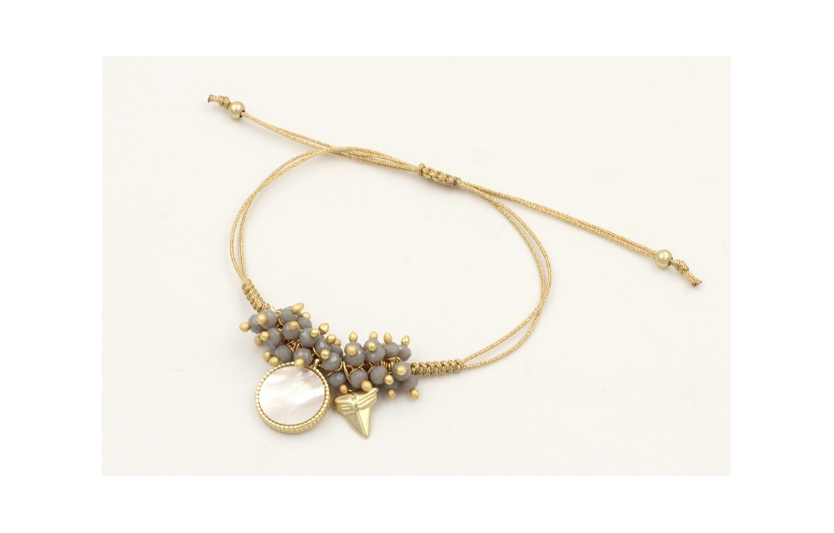 Pulsera hilo dorado palido con colgante disco dorado mate engarzado con nacar, diente tiburón pequeño y burruños cristales grises. Es regulable