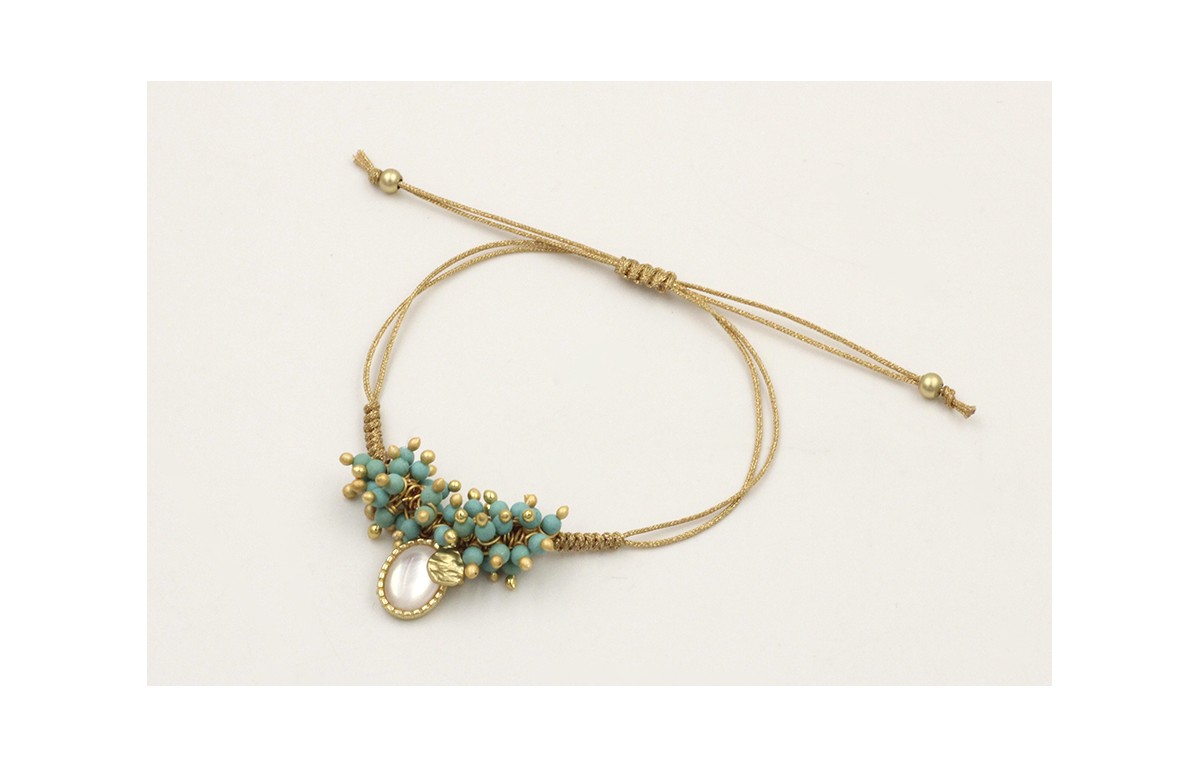 Pulsera hilo dorado palido con colgante colgante ovalado dorado mate engarzado con nacar, colgante lámina labrada pequeña y burruños de corales. Es regulable