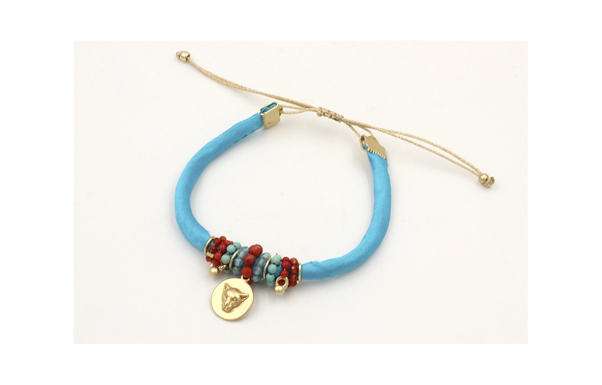 Pulsera seda rellena turquesa colgante disco cabeza tigre y circulos de piedras en tonos coral y azules, cierre macrame dorado palido. Es regulable.