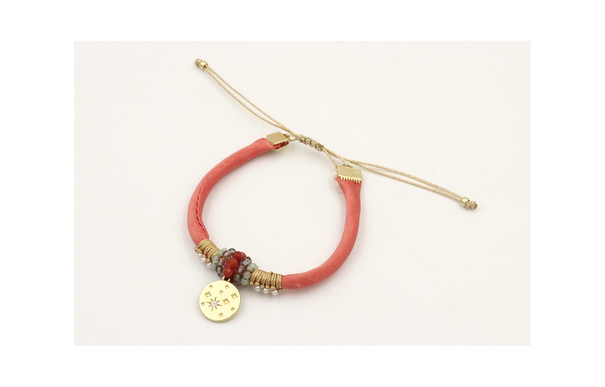 Pulsera seda rellena salmón con nudo macrame con perlas, disco dorado mate con sol y micro brillos, cierre macrame dorado palido. Es regulable.