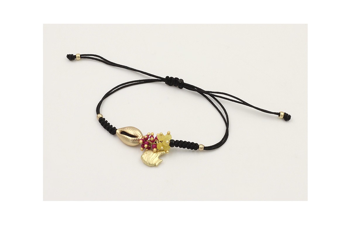Pulsera hilo negro nudo serpiente con concha y colgante pez dorado mate. Es regulable.