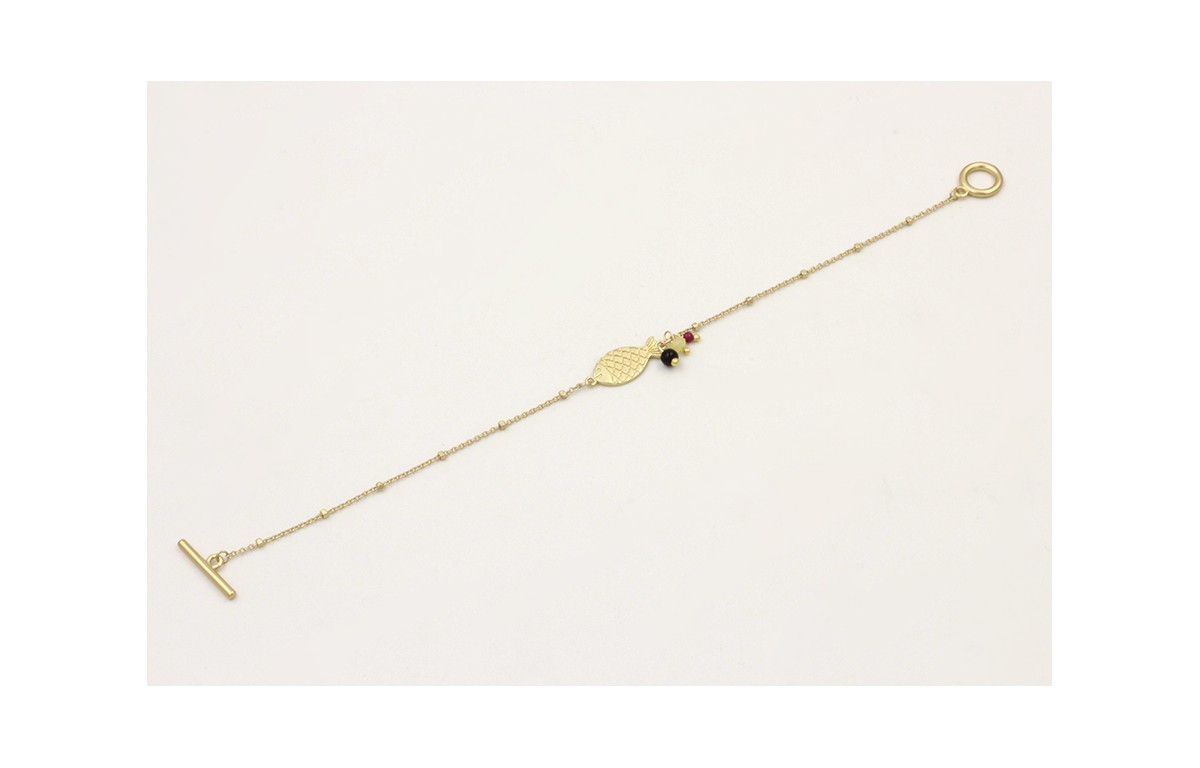 Pulsera cadena micro bola dorada mate con pez, abalorios y cierre marinero pequeño. Largo 17cm.