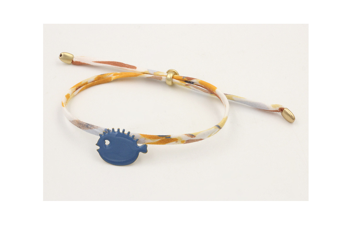 Pulsera lazo liberty blanco con flores mostaza,marrón con pez globo esmaltado azul. Es regulable