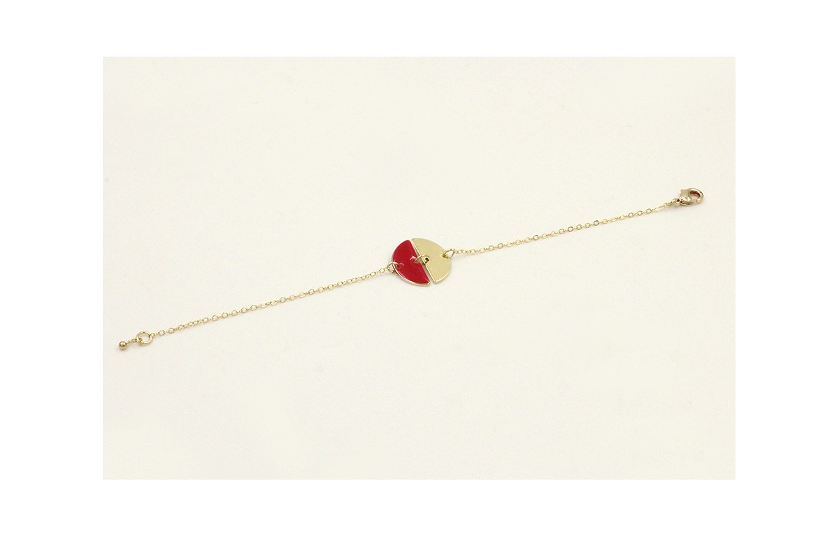 Pulsera cadena eslabón pequeño dorado con 2 semicriculos uno esmlatado rojo y otro dorado. Largo 17cm.