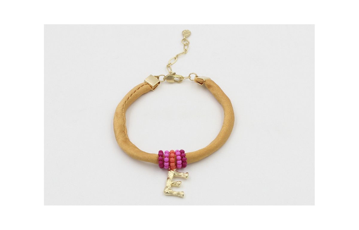 Pulsera seda mostaza con aritos de abalorio rosa,naranja y morado con letra E,rematada con terminales y cadena de eslabón ovalado dorado mate. Es regulable.