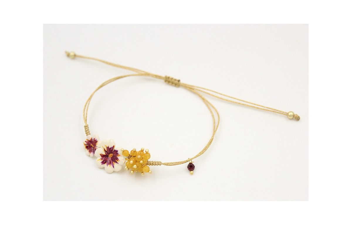 Pulsera nudo serpiente oro pálido con flores esmaltadas blanca,naranja,morado y burruño bolitas mostaza. Es regulable
