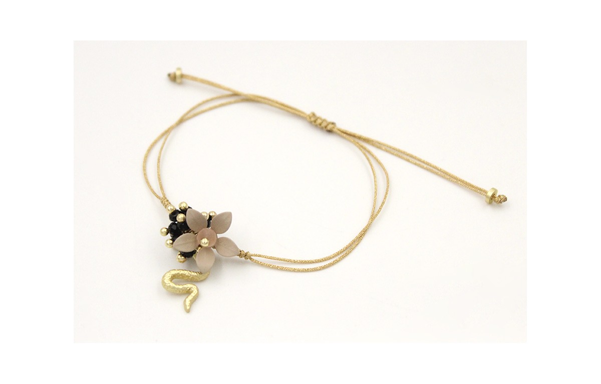 Pulsera nudo serpiente oro pálido con flor esmaltada visón, burruño de facetadas negras y colgante de culebra. Es regulable.