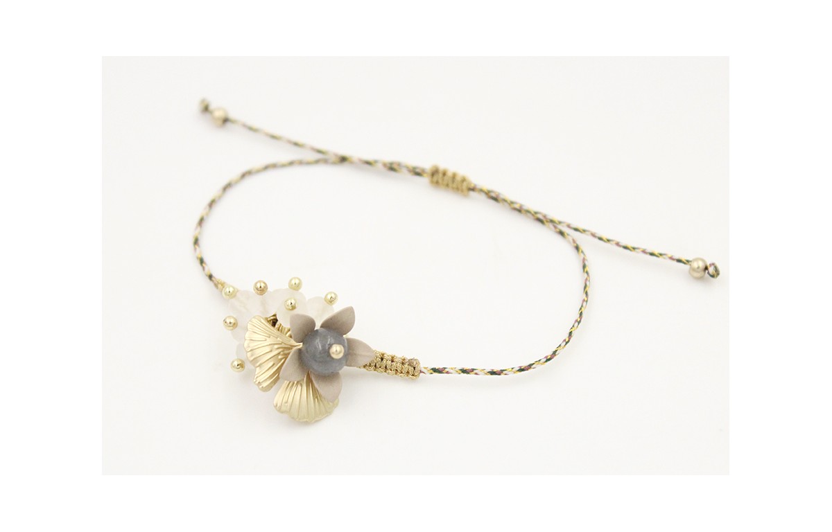 Pulsera hilo micro driza marrón,rosa y oro con macrame dorado y burruño facetadas blancas translucidas,hoja de gingko, casquilla flor esmaltada visón y bola girs. Es regulable.