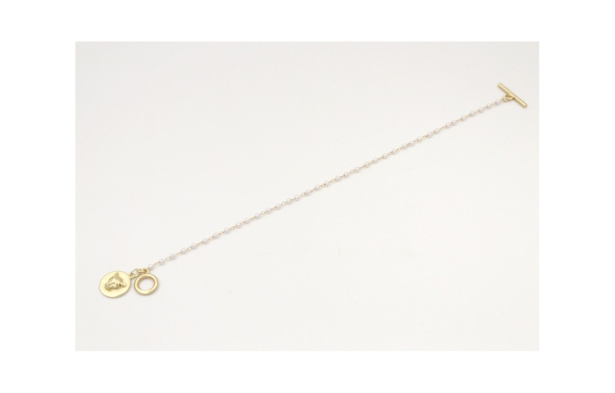 Pulsera cadena dorada con microperla y colgante disco cabeza tigre oro mate y cierre marinero oro mate. Largo 17cm.