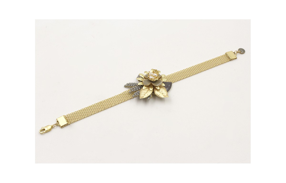 Pulsera cadena tira plana dorada mate con flor 11 pétalos,perlas, flor girs, hojas,triangulo esmaltado gris y ramas de miyuki gris. Largo 17cm.