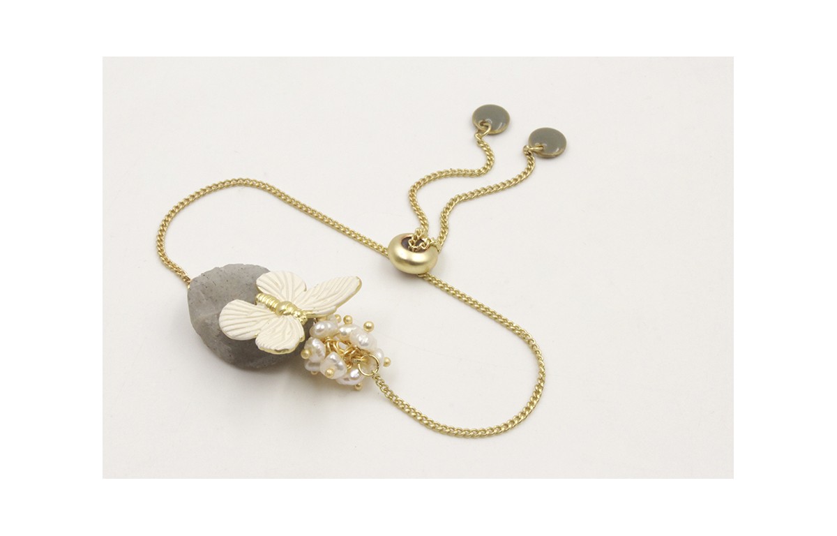 Pulsera eslabón plano dorado mate con flores y burruño perlas naturales rematada con disco esmaltado gris. Largo 17cm.