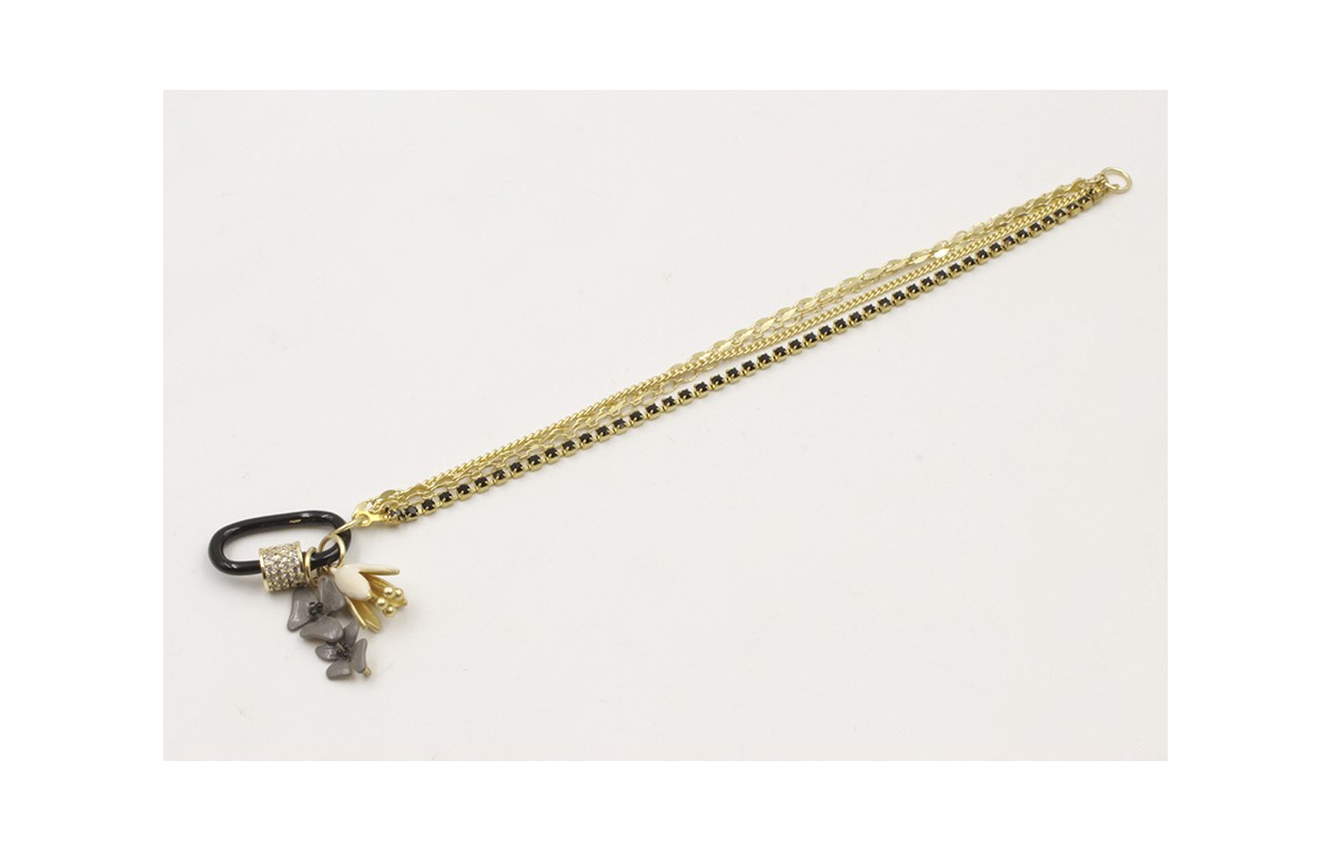 Pulsera 4 cadenas con cierre eslabón negro, flores esmaltadas grises y campanilla beige. Largo 17cm.