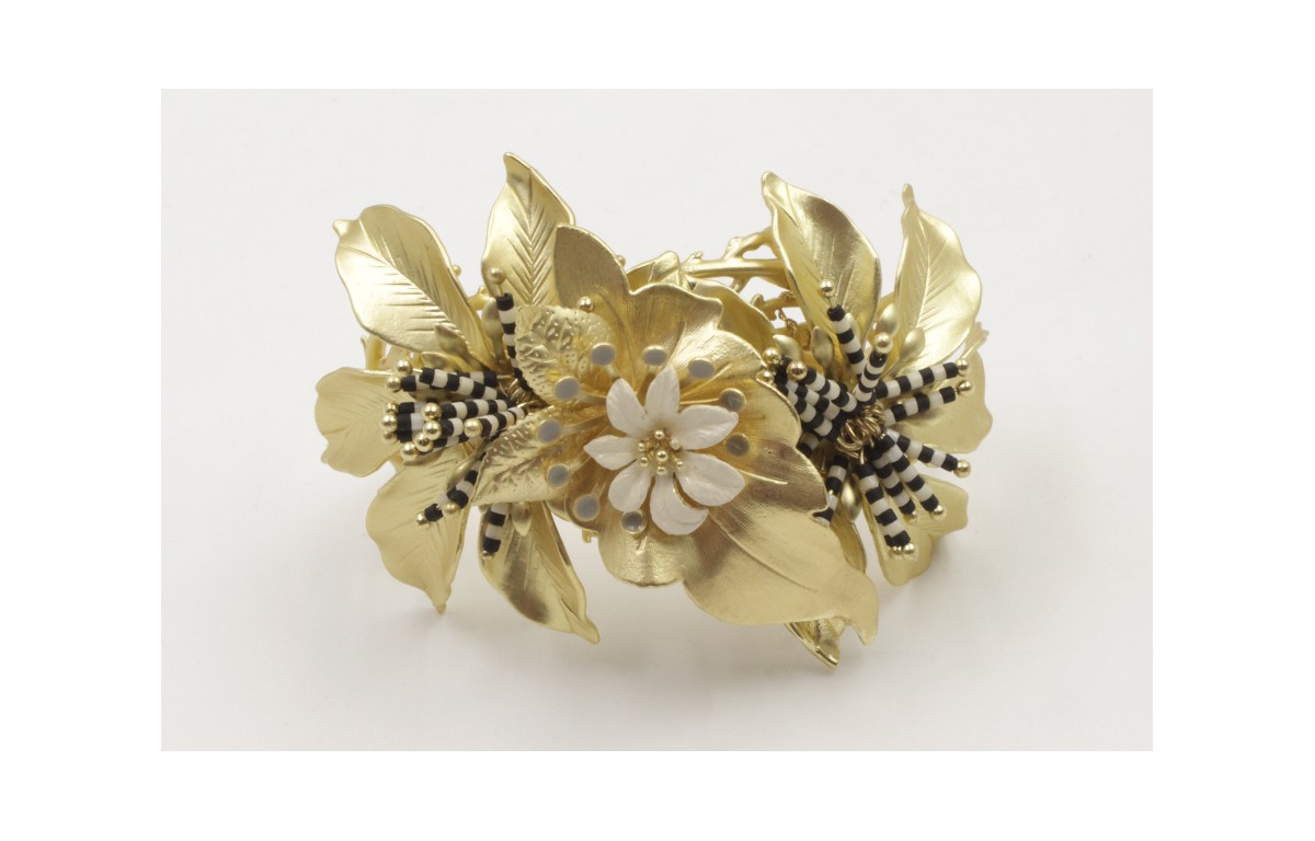 Brazalete de coral con flores 7 pétalos grande,hoja perforada, palitos de miyuki negro y beige, flor esmaltada beige,pistilos beiges y hojas.