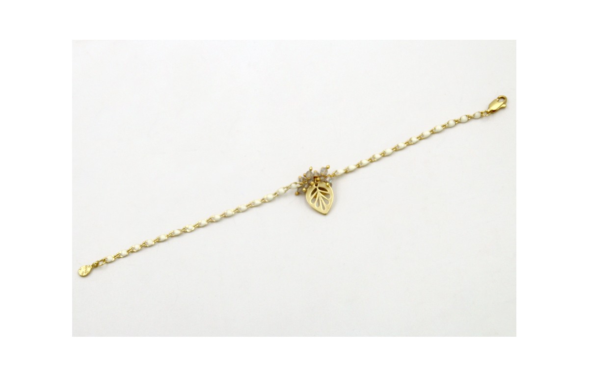 Pulsera cadena esmaltada blanca con hoja calada dorada mate con burruño de facetadas cristal rematada con lámina labrada. Largo 17cm.