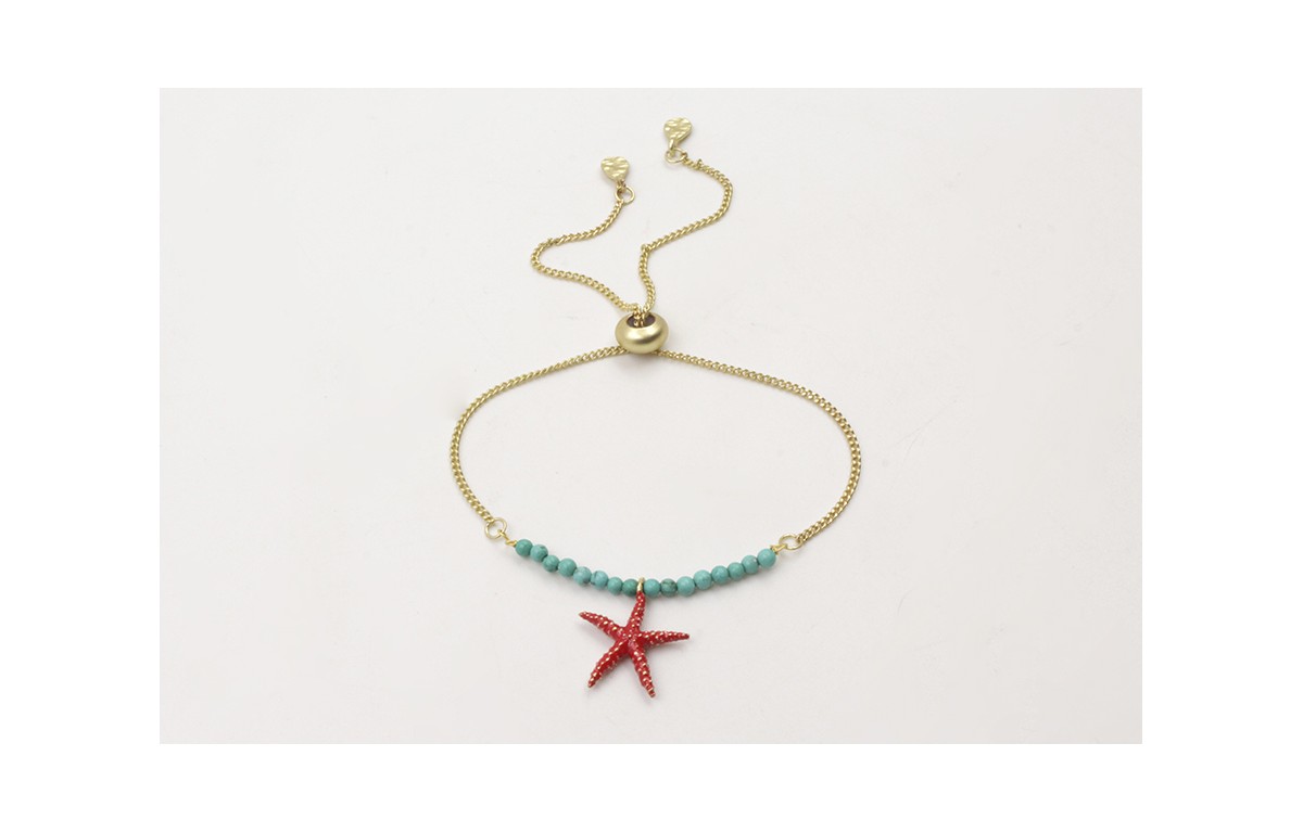 Pulsera cadena plana dorada mate regulable con tira piedras turquesas y colgante estrella esmaltada roja rematada con gotas labradas. Es regulable.