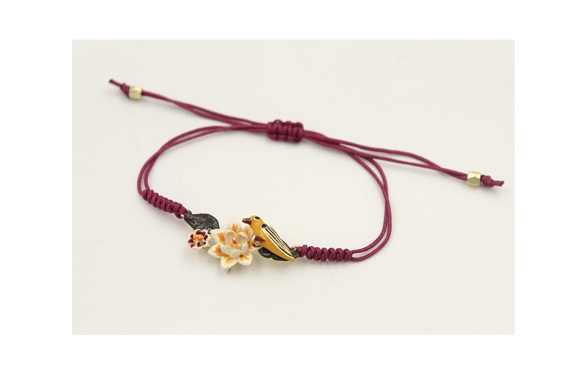 Pulsera hilo granate con nudo serpiente centro adorno hojas pintada blanco,verde y naranja con pajarito amarillo y negro. Es regulable.