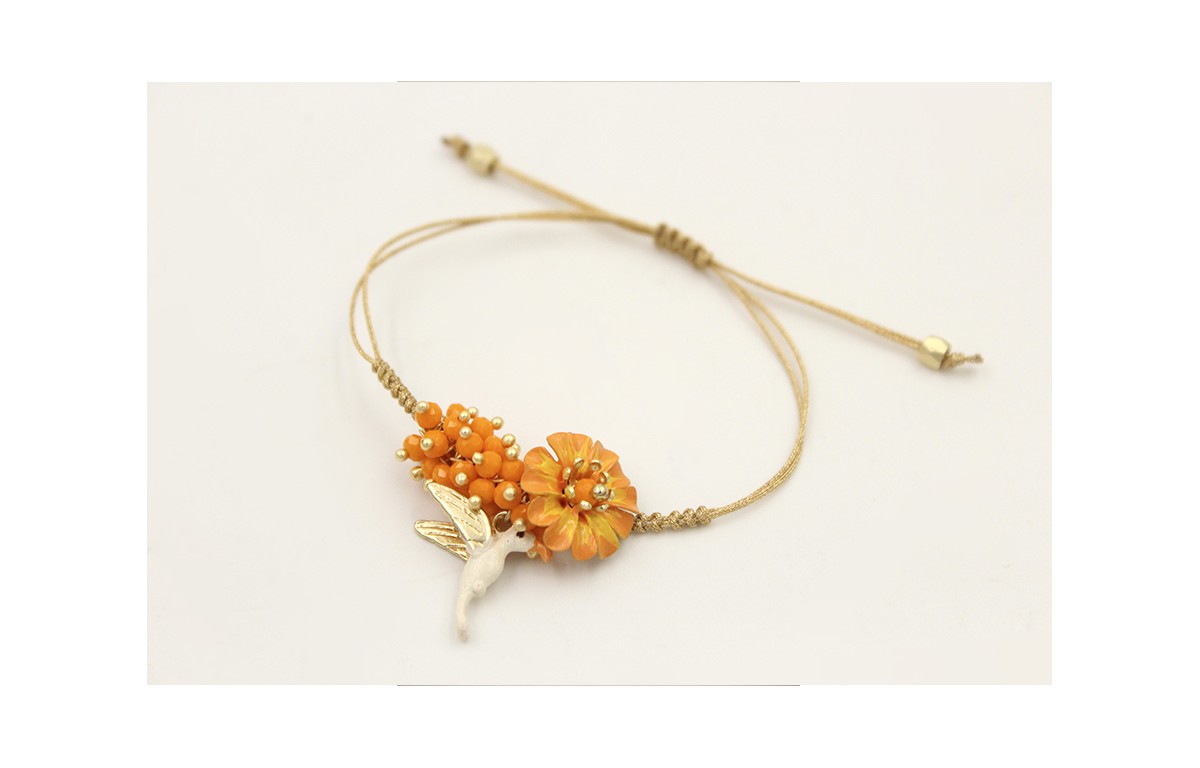 Pulsera hilo fino dorado con nudo serpiente, burruño facetadas naranjas con colibrí blanco y margarita esmlata amarillo.