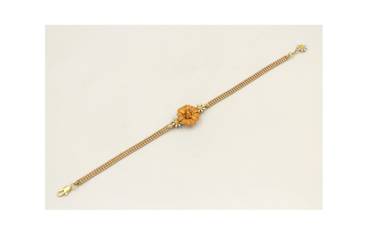 Pulsera cadena bolas 3 bandas dorada mate con margarita naranja y amarilla y margaritas pequeñas blanca y amarilla. Largo 17cm.
