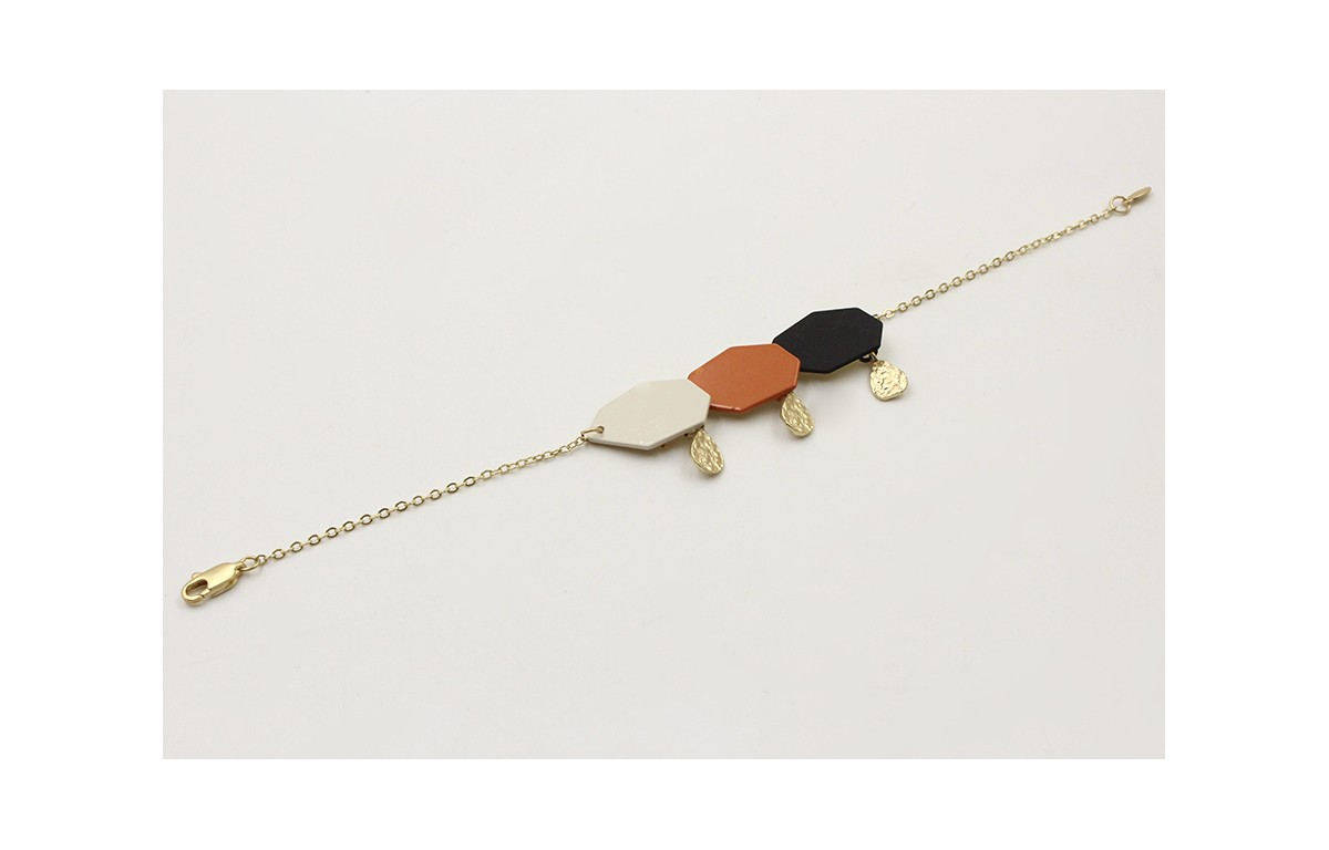 Pulsera cadena de eslabón doarado mate con hexágonos beige,teja y dorado. Largo 17cm.