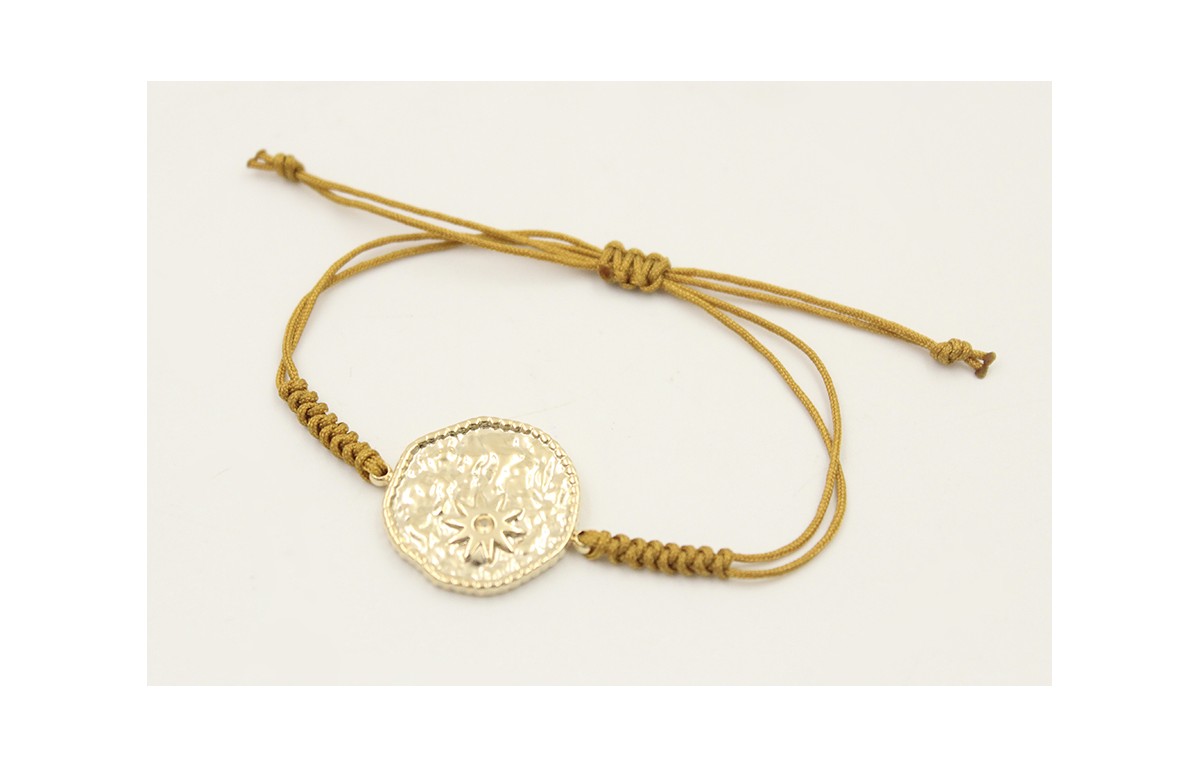 Pulsera hilo color marrón claro con nudo serpiente y chapa planetas de acero inoxdable. Es regulable