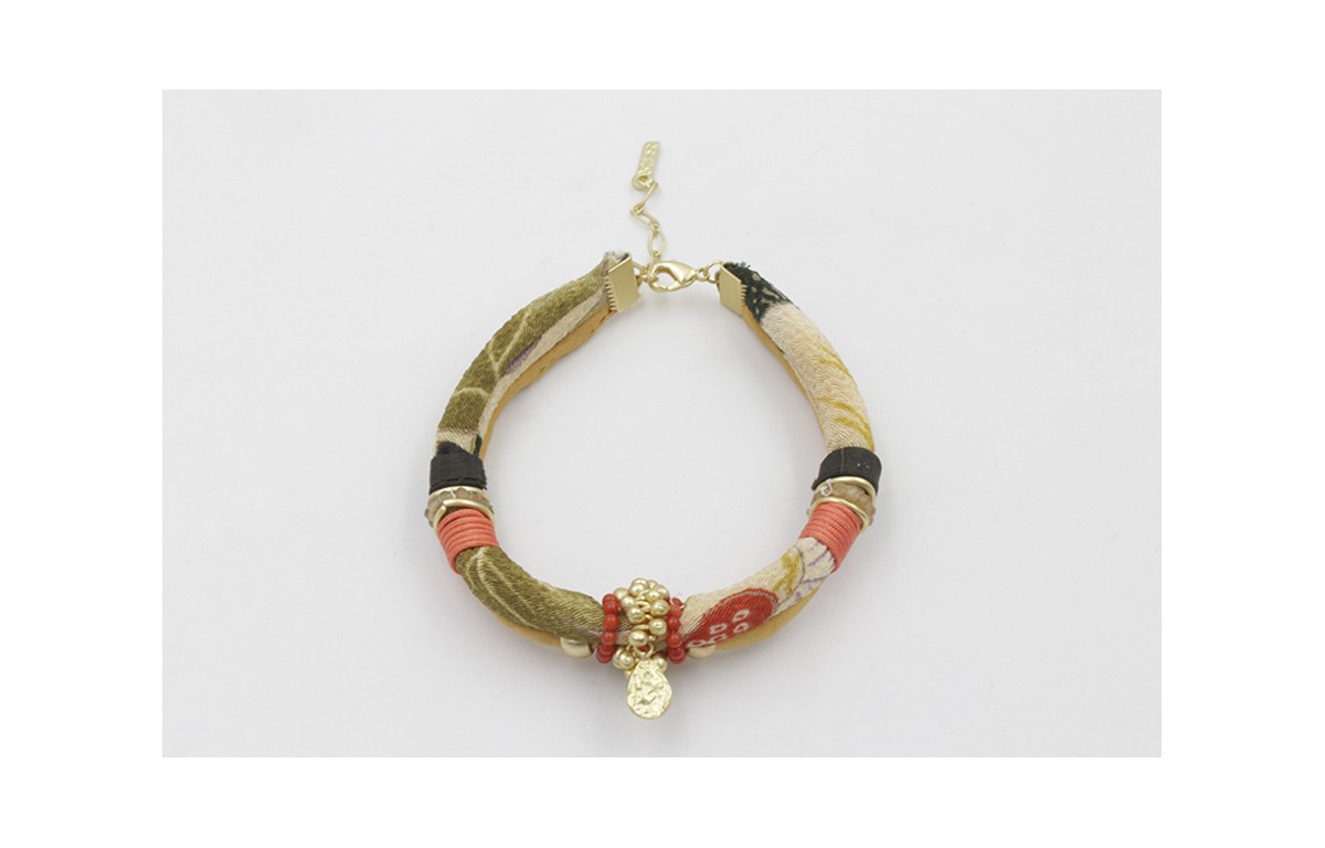Pulsera seda natural mostaza y lazo tubo kimono verdes con aros piedras topacio,rojo,lámina labrada y bolitas dorada mate. Largo 17cm.