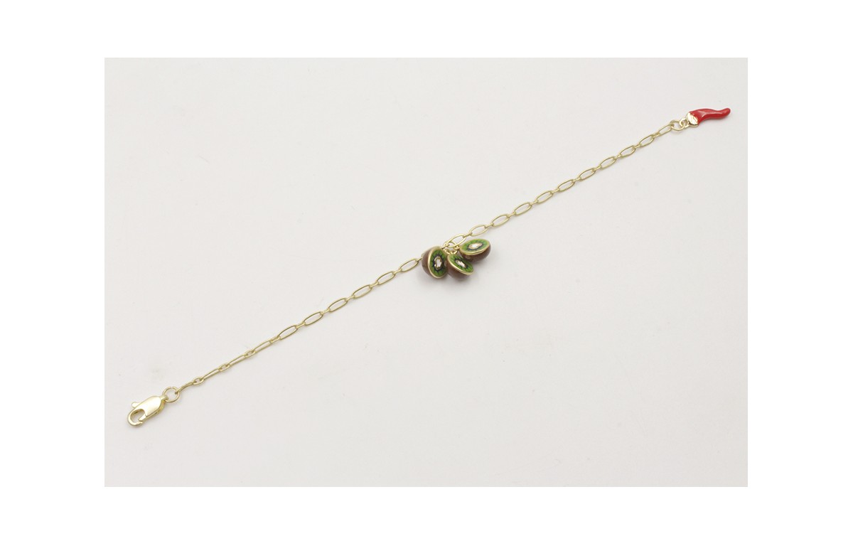 Pulsera con cadena alargada de eslabón oro mate con kiwis y pimiento esmaltados. Largo 15cm.