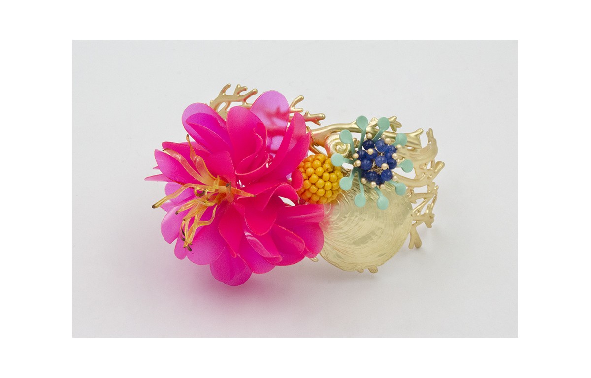 BRAZALETE CORAL DORADO MATE CON LENTEJUELAS FUCSIA Y AMARILLA, CARACOLA DORADA MATE, CONCHA PLANA, CASQUILLA ESMALTADA TURQUESA,BOLA ABALORIO MOSTAZA.
