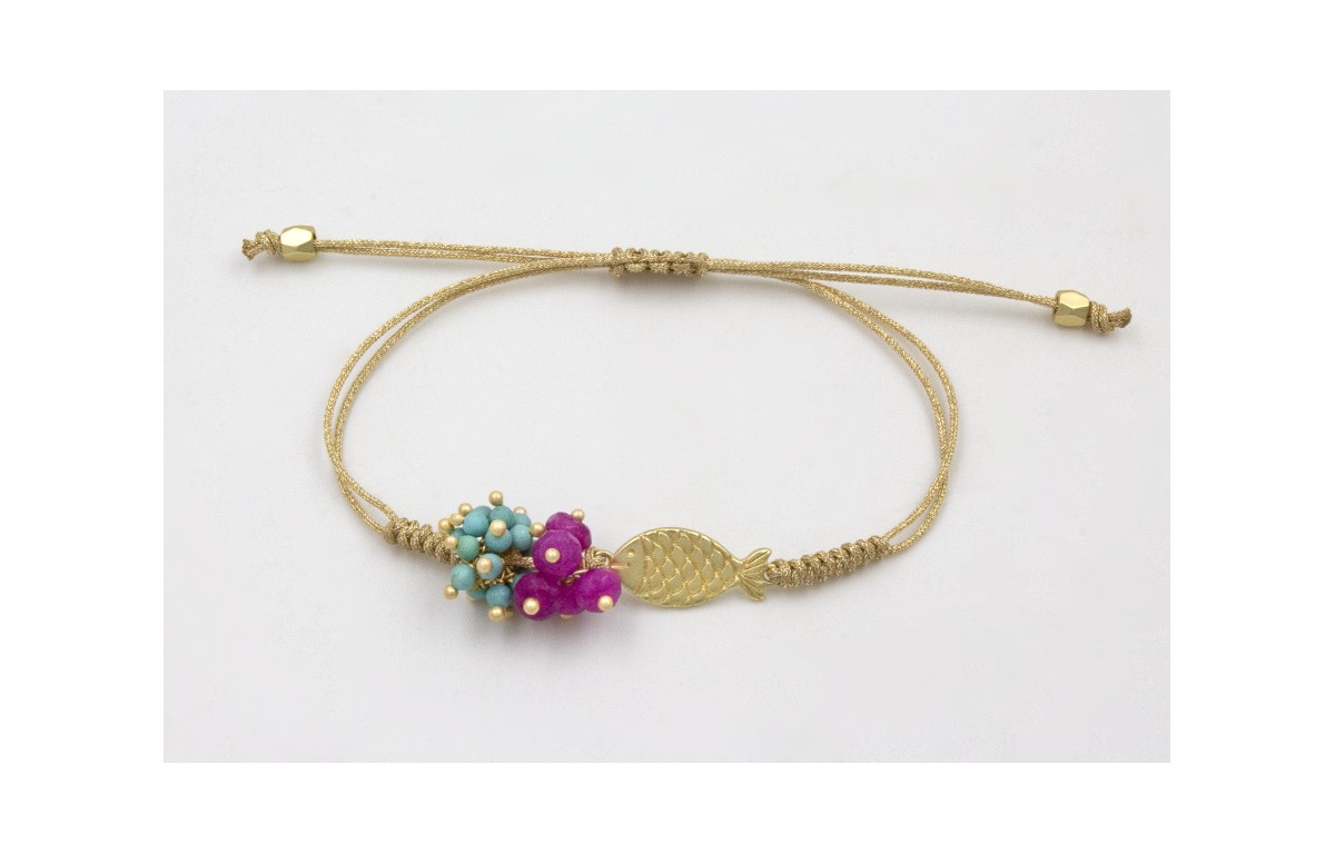 Pulsera hilo dorado con nudo serpiente, pez dorado mate y burruño bolas semipreciosas. Es regulable.