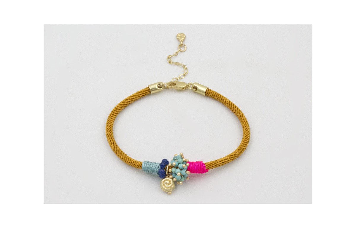 Pulsera cordón retorcido mostaza forrada con hilo fucsia y menta con colgante caracolillo dorado mate, aro de bolitas semipreciosas turquesas. Largo 17cm.
