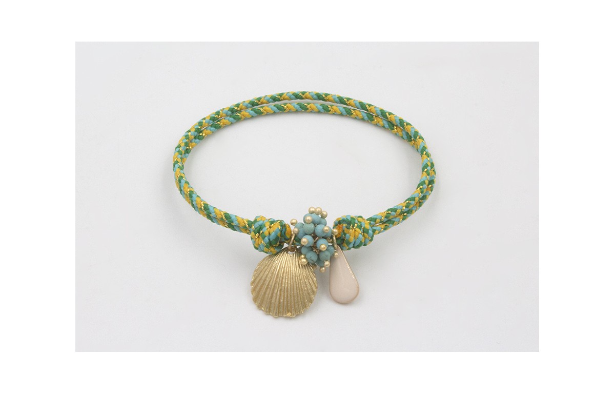 Pulsera nudo corredizo de driza verde y turquesa con burruño bolas turquesas, concha dorada mate y lagrima esmaltada crema. Es regulable.