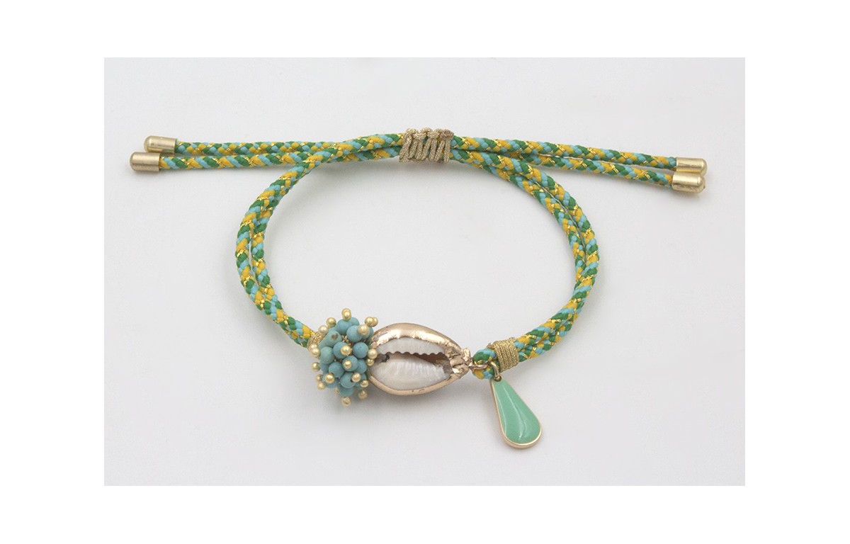 Pulsera de driza verde y turquesa con burruño bolas turquesas, caracola borde dorado y lagrima esmaltada turquesa, rematada con nudo macramé dorado. Es regulable.