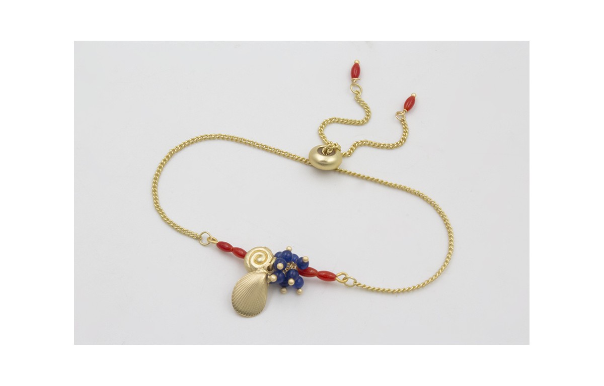 Pulsera regulable cadena eslabón plano dorado mate,coralitos, burruño bolas azulonas, caracolillo dorado mate y concha mejillón. Es regulable.