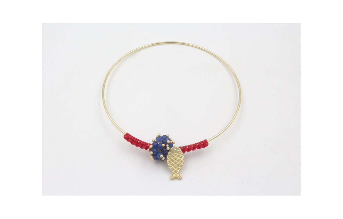 Pulsera rigida dorada brillo con nudo macramé rojo colgantes pez dorado mate y burruño bolas azulonas.