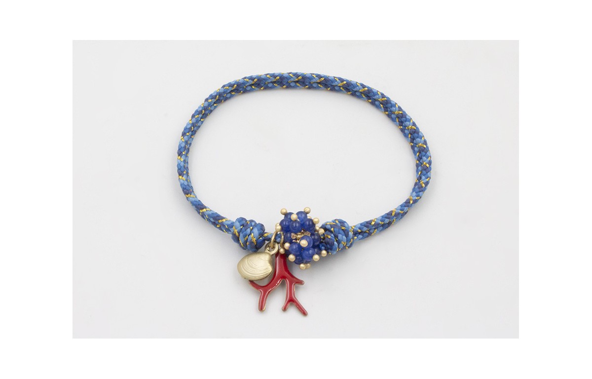Pulsera nudo corredizo de driza azul y dorado con burruño bolas azulonas, almeja pequeña dorada mate, rama coral esmaltada roja. Es regulable.