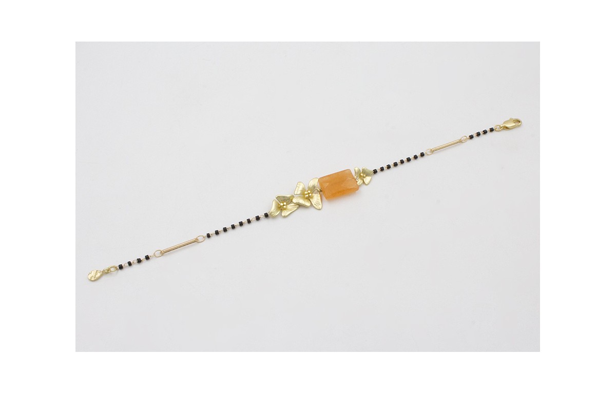 Pulsera cadena miyuki negro con eslabón alargado con trio flores doradas mate y piedra facetada melocotón.