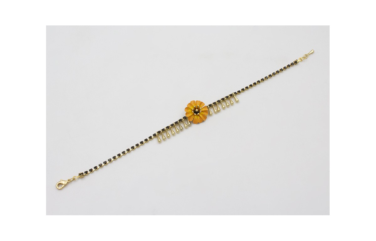 Pulsera cadena eslabón ovalado por partes doardo mate con flor esmalte manual naranja y amarillo, rematada con cadena de eslabón retorcido.