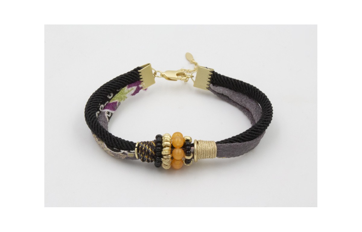 PULSERA LAZO TUBO KIMONO GRISES Y CORDÓN RETORCIDO NEGRO CON AROS PIEDRAS MELOCOTÓN,DISCOS IRREGULARES, NUDOS FALSOS DE HILO DORARO Y NEGRO . LARGO 17CM.