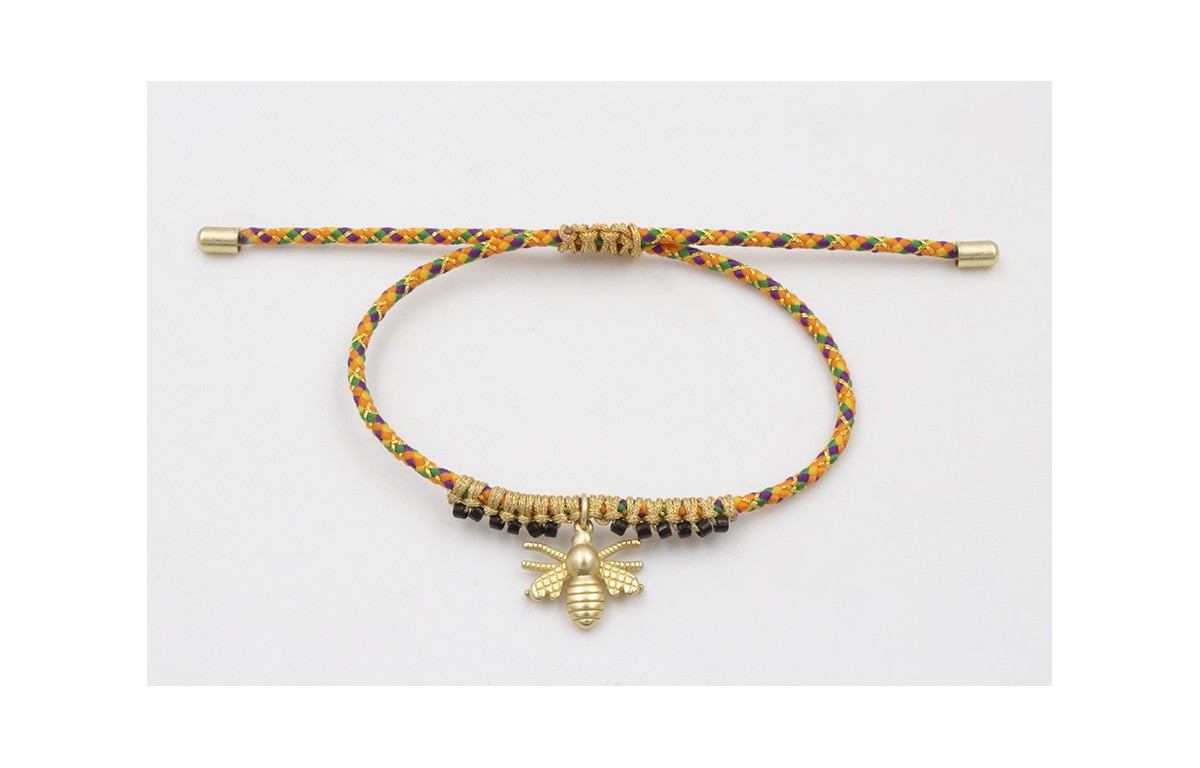 Pulsera de driza naranja y verde con nudo macramé dorado,miyuki negro y colgando abeja dorada mate, rematada con nudo macramé dorado. Es regulable.