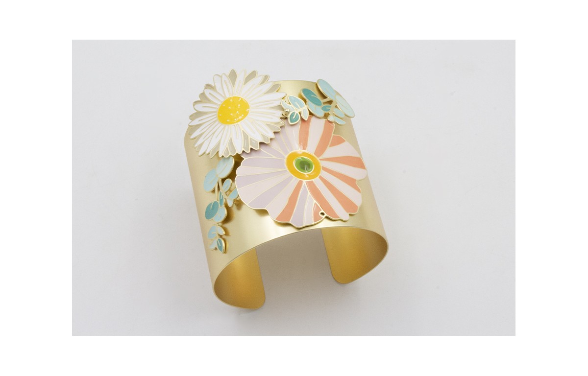 Brazalete con piezas esmaltadas, flor grande plana rosa y mostaza, rama plana turquesa, flor blanca y mostaza, rematado con cadena de eslabón plano dorado mate.