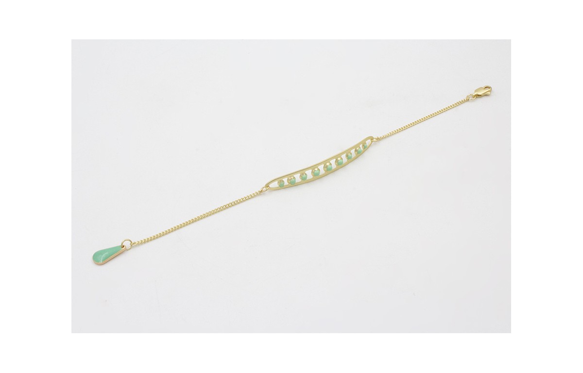 Pulsera cadena eslabón plano dorado mate con vaina guisantes esmaltada turquesa rematada con gota turquesa. Largo 17cm.