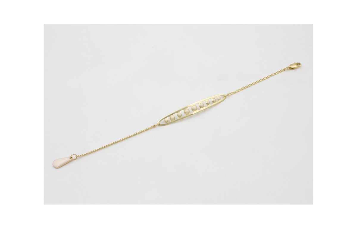 Pulsera cadena eslabón plano dorado mate con vaina guisantes esmaltada blanca rematada con gota rosa claro. Largo 17cm.