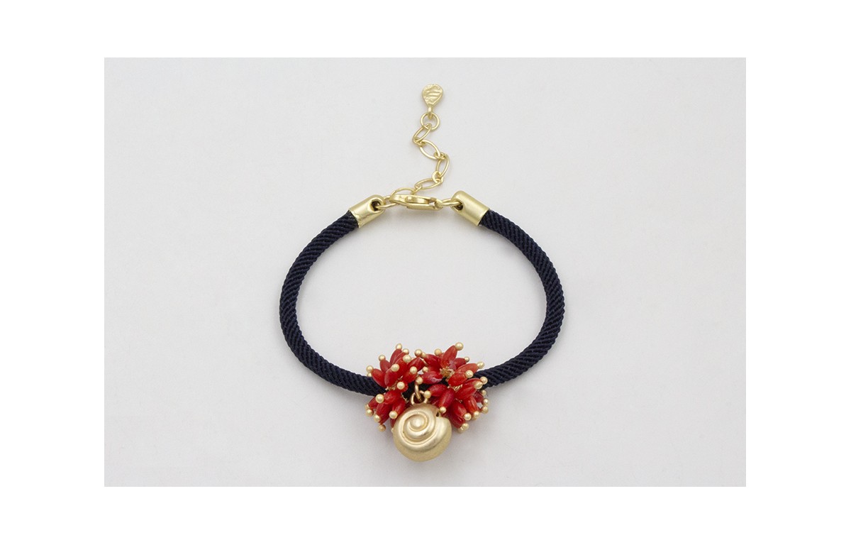 Pulsera de cordón trenzado azul marino con burruño de ovalos de coral y caracola dorada mate, rematadado con cadena alargadora. Es regulable.